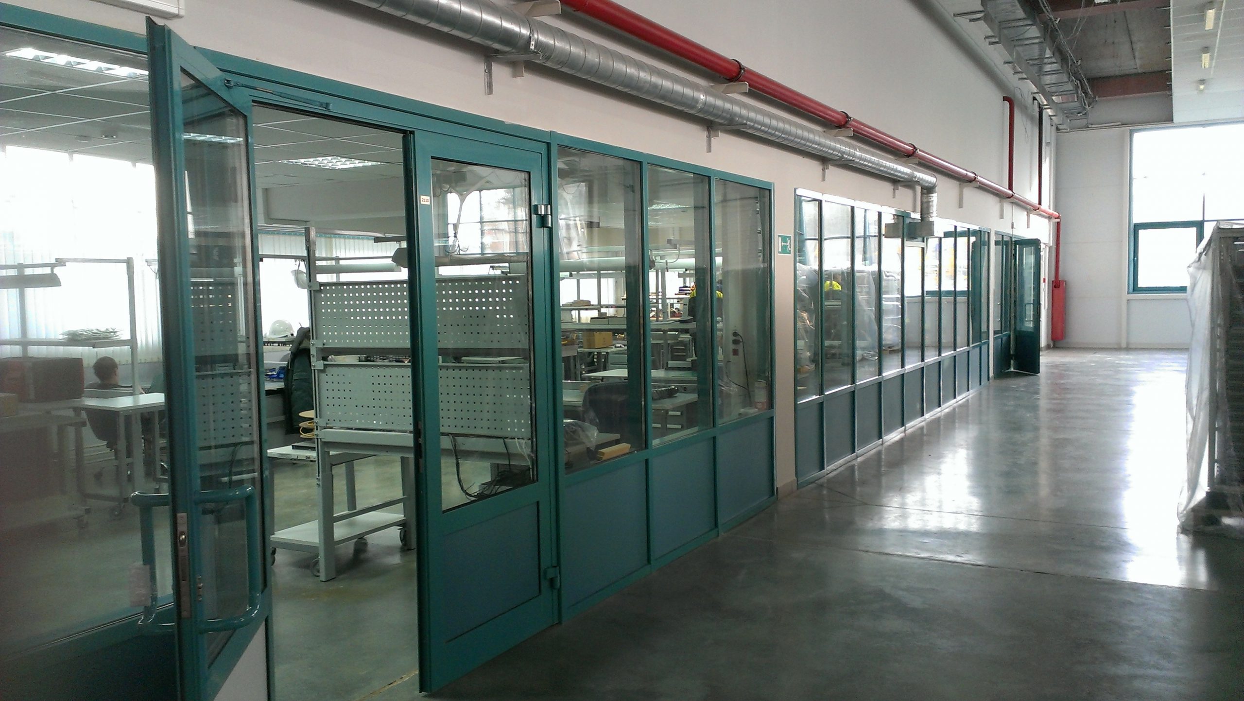 В производстве перегородок со стеклом применяется надежный профиль, внутренние модули делаются одинарным либо двойным остеклением. При необходимости между стеклами устанавливаются жалюзи. Глухие каркасные конструкции могут дополняться листовым непрозрачным материалом. В перегородки можно устанавливать самые разные двери: распашные, маятниковые, раздвижные и пр.
